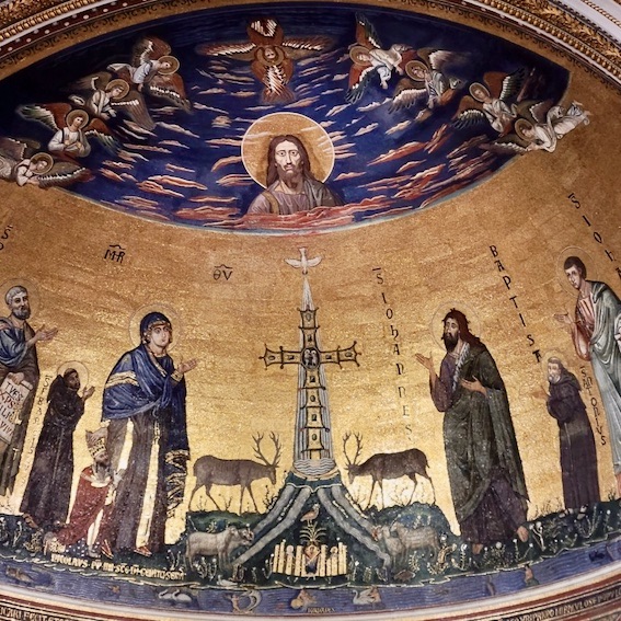 De Sint-Jan van Lateranen is de kathedraal van de paus en draagt de titel ‘moeder en hoofd van alle kerken van Rome en van de wereld.’ Het is dus gepast dat haar apsismozaiek het kruis toont als de bron van het leven van de Kerk.