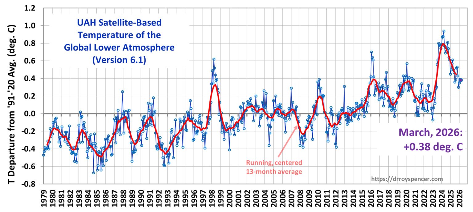 In de Verenigde Staten doet dr. Roy Spencer, meteoroloog aan de Universiteit van Alabama o.a. onderzoek naar het temperatuurverloop van de aardse atmosfeer middels satelieten (www.drroyspencer.com). Het voordeel daarvan is dat plaatselijke omstandigheden op het aardoppervlak (zoals de warmtebron die steden zijn) geen rol spelen bij zijn metingen. Zijn maandelijkse grafiek: