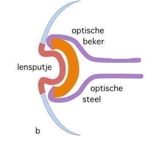 b. Het optische blaasje stopt met groeien wanneer het de lensplacode heeft geraakt en wordt door instulping omgevormd tot de optische beker (oogbeker).