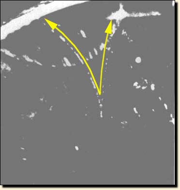 Een foton, een lichtkwantum, dat een bepaalde hoeveelheid energie vertegenwoordigt, wordt hier omgezet in massa, in twee stoffelijke deeltjes materie. Door de annihilatie (vernietiging) door botsing van het licht'deeltje' dat onzichtbaar van beneden komt, worden twee massadeeltjes gevormd, die door de invloed van een magnetisch veld uit elkaar worden getrokken (de gele pijlen). Hun baan wordt zichtbaar door de condensatie van waterdamp in een nevelkamer of bellenvat.