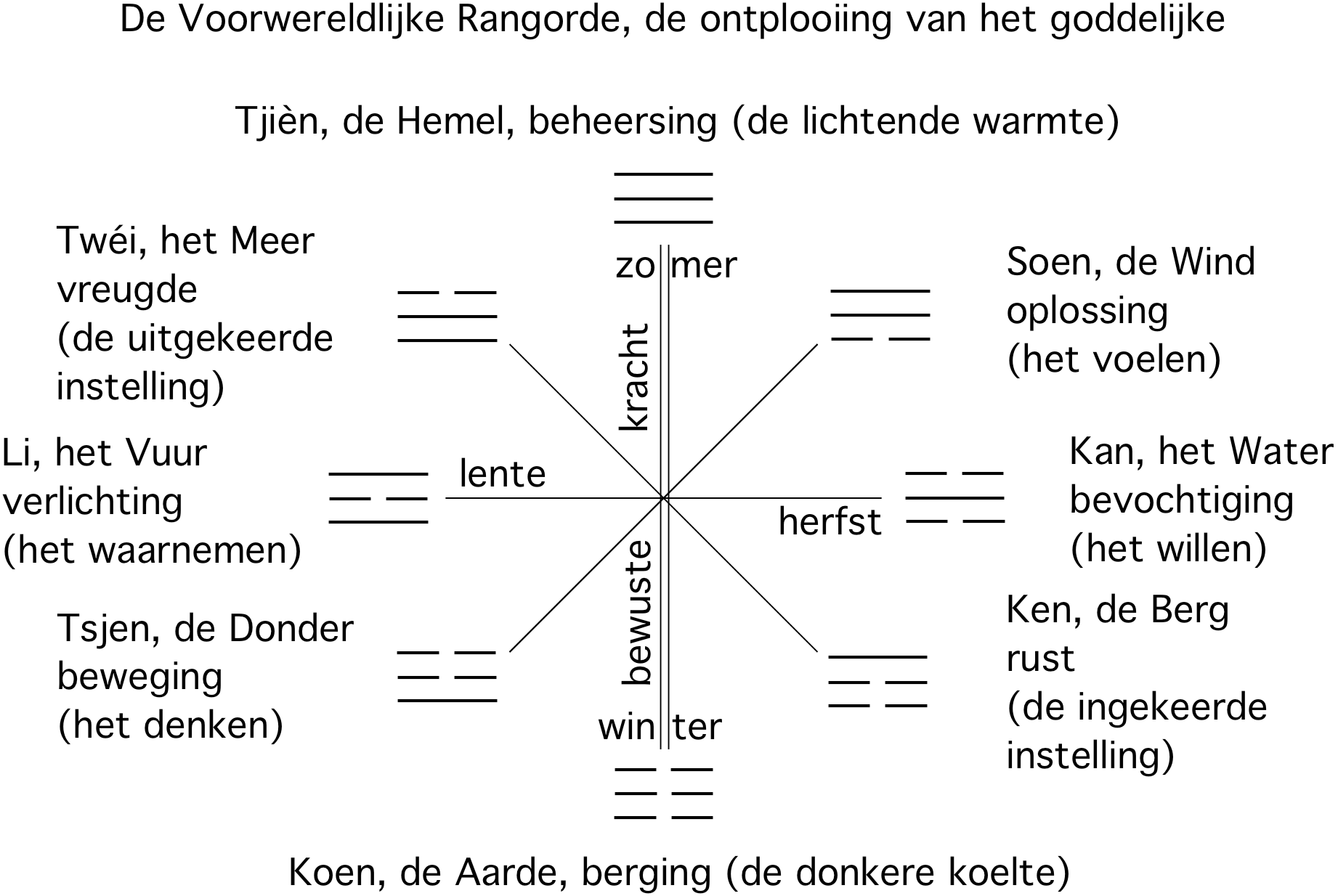 In de beschrijving van de eigenschappen van de acht oertekens, de trigrammen Tj'ièn, Koen, Tsjen, Soen, Li, Kan, Twéi en Ken, zijn de eigenschappen van de vier geestelijke vermogens en de beide instelling te herkennen.