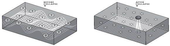 Rechts: De locatie van de bal wordt gemeten en op een bepaalde plek gevonden. De golffunctie stort dan onmiddellijk en volledig in, wordt radicaal ongehoorzaam aan de Schrödingervergelijking.