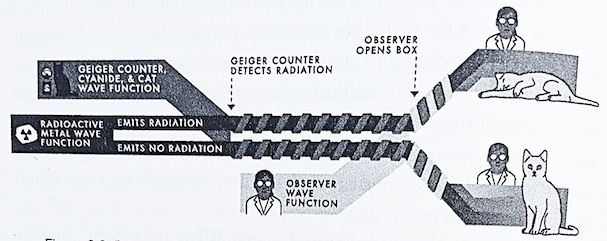 Nou, in dat geval, als je in de doos kijkt, heb je er interactie mee - wat betekent dat je verweven (entangled) raakt in de gedeelde golffunctie van de doos en alles wat erin zit. Dus nu hebben we een nog grotere golffunctie, nog steeds met twee delen: een waar je een dode kat ziet en een kapot flesje gif, en een waar je een blije kat en een intact flesje ziet. Welk deel van de golffunctie is echt? Everett antwoordde dat beide echt zijn. Er is geen manier om de ene als reëler te kiezen dan de andere; de Schrödingervergelijking behandelt ze gelijk. Dus wanneer je dit experiment uitvoert, zei Everett, treden beide resultaten op - en jij splitst in tweeën. Dit is een kenmerk van de vele-werelden interpretatie: het verschijnen van een enkele wereld in onze dagelijkse ervaring, ondanks het ware bestaan van vele werelden" (p.125-7). Zie Figuur 3.