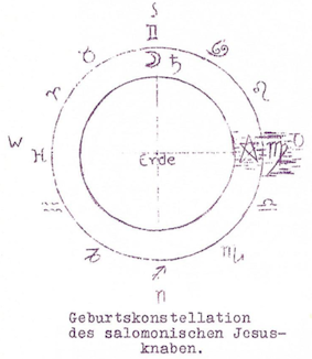 Der 'salomonische Jesusknabe', jener Knabe des Matthäus-Evangeliums, der die Zarathustra-Seele in sich trug, wird kurze Zeit vor dem andern Jesusknaben geboren, d.h. kurze Zeit vor dem Weihnachtstage des ersten Jahres unserer Zeitrechnung. (7) Seine Geburt unterlag der Sternengesetzmässigkeit, die sich z.B. in seiner Geburtskonstellation ausdrückte. Und diese wiederum ist mit einer andern Konstellation verbunden, die sich vor der Geburt abspielt und das Herannahen einer auf Erden niedersteigenden Seele ankündigt.
