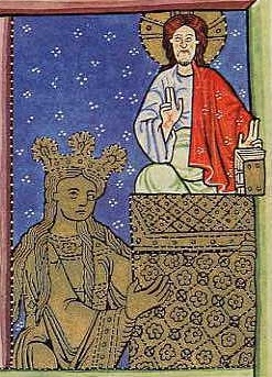 1. Rechts boven is de kerk (Gr. ekklesia: volksvergadering, gemeenschap, gemeente) als koningin met gouden kroon en gewaad, ook gezicht en handen zijn van goud. De tekst: de gulden schittering wijst op het goddelijke licht (Jezus' leer) dat haar als een gewaad bekleedt. Zij omhelst Jezus' preek-stoel (leerstoel) zoals een geliefde haar bruidegom - een gebaar dat de vereniging van Jezus met de Kerk als gemeente weergeeft. Daarop zit Jezus met een boek, zijn leer, in de hand. Hier maken beide handen het belerende (retorische) gebaar: ik spreek de waarheid, geestelijke leer.