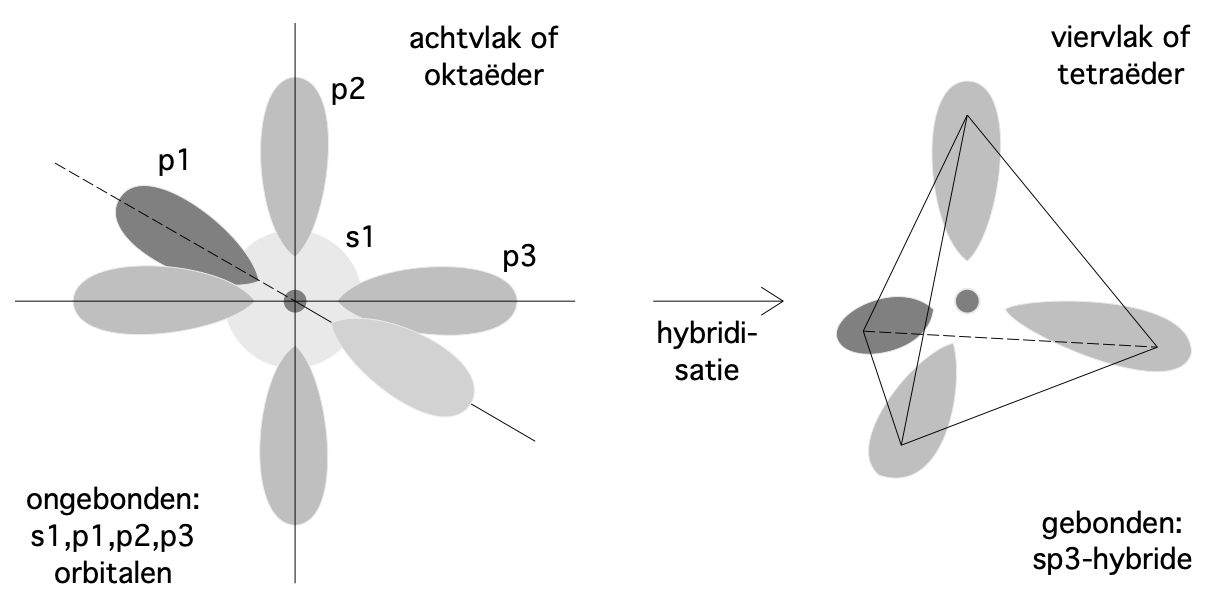 Als zij niet chemisch zijn gebonden aan andere atomen, zien de orbitalen van genoemde elementen eruit zoals links op de afbeelding: de vorm is een oktaëder; maar is er sprake van een chemische binding, dan vloeien de s- en de p-orbitalen zo samen, als rechts is afgebeeld. Hun orbitalen nemen in een chemische binding de vorm aan van een viervlak, een tetraëder.