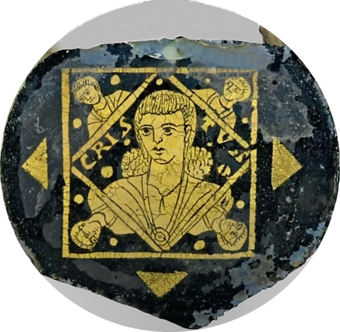 Een rond, donker glazen gebedstafeltje, met goud bedrukt. Jezus is afgebeeld met een schaap op de rug als goede herder, begeleider, leraar.