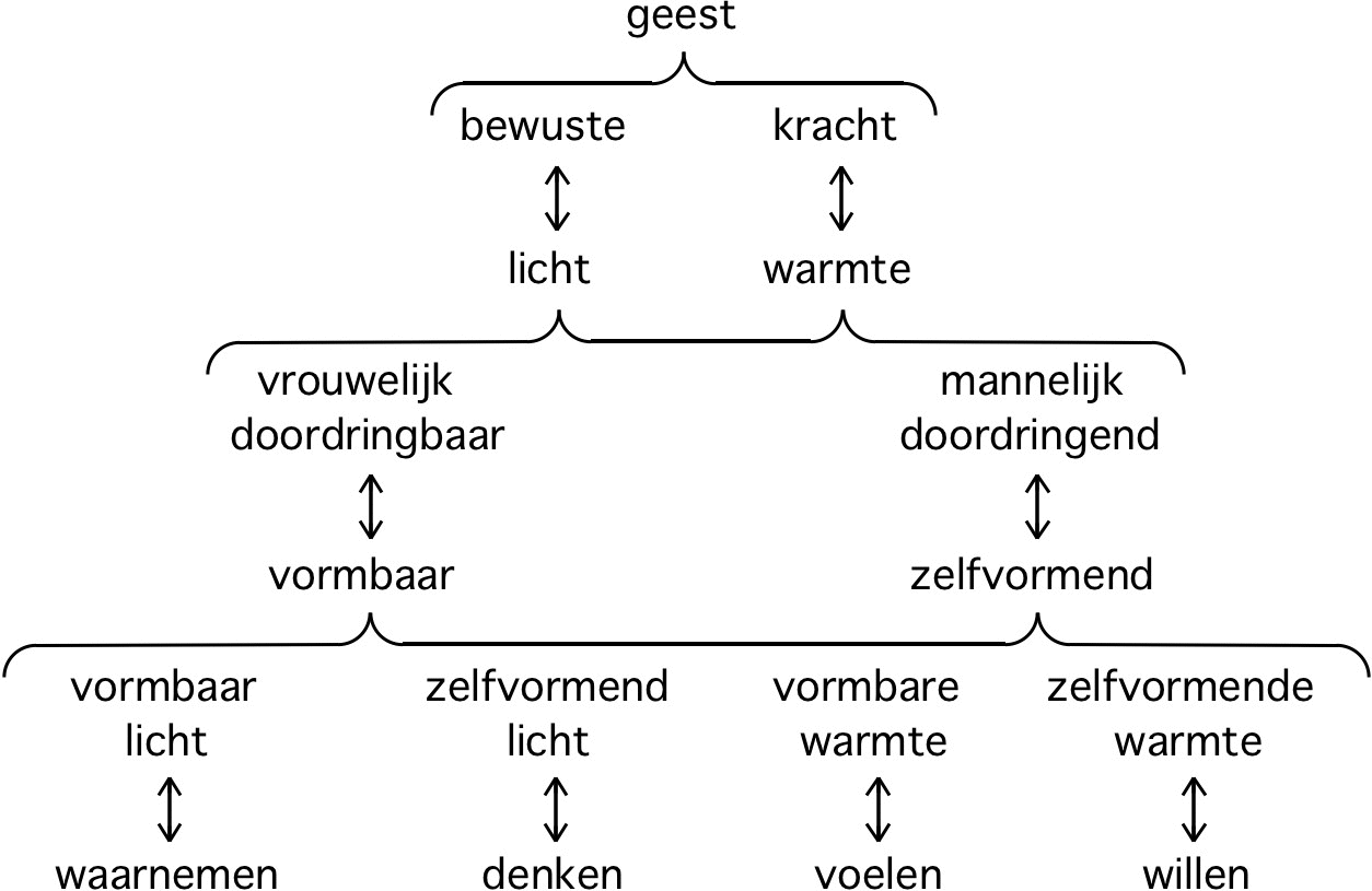 De menselijke geest is een bewuste kracht, die zich in de geestelijke wereld voordoet als geestelijk licht en geestelijke warmte. De geest kan - zoals de algeest - zowel het licht alsook de warmte in zichzelf in twee tegenovergestelde toestanden brengen, namelijk: in een doordringbáre en in een doordríngende toestand. In de doordringbare toestand van de geest zijn het licht en de warmte van buitenaf beweegbaar en vórmbaar; en in de doordringende toestand kan de geest met het licht en de warmte van binnenuit zélfvormend en zélfscheppend, en vervolgens doordringend werkzaam zijn.