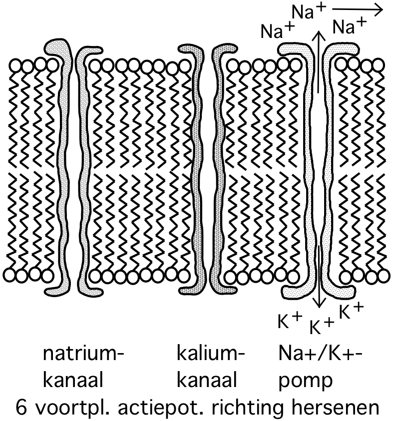 De zenuwprikkel verloopt niet alleen óver, maar ook dóór de wand van het membraan. Daarvoor bevinden zich in het membraan drie soorten buisvormige eiwitten: een kaliumkanaal en een natriumkanaal genoemd, en een ionenpomp, de zogenoemde Na/K-pomp.