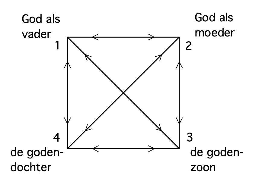 Dit vierkant beschrijft ook de werkelijkheid van de godheid in de vorm van het oergezin: de verhouding tussen een, twee, drie en vier, die in het gezin een hechte eenheid vormen doordat de zoon en de dochter uit de vader en de moeder zijn voortgekomen als een nieuwe schepping, als een paar dat een voortzetting is van henzelf.